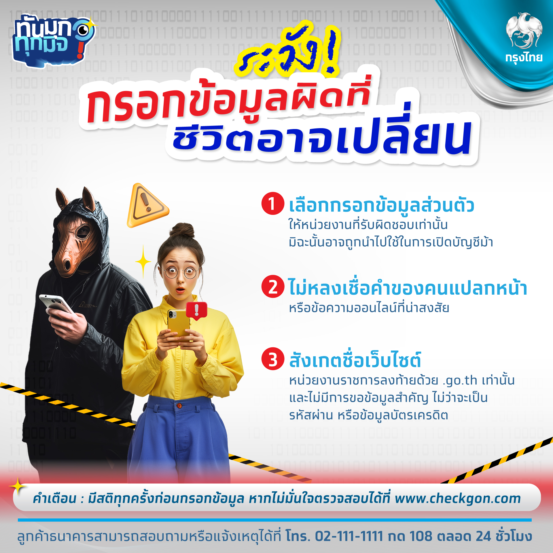 คำเตือน: มีสติทุกครั้งก่อนกรอกข้อมูล อย่าลืมตรวจสอบ URL ของเว็บให้ถูกต้องทุกครั้งก่อนกรอกข้อมูล หากไม่มั่นใจตรวจสอบได้ที่ www.checkgon.com